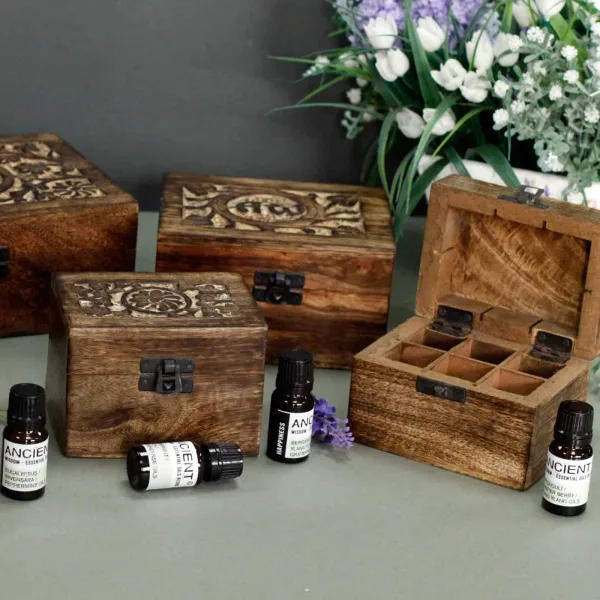 Trææske til æteriske olier i bæredygtigt mangotræ, der sikrer korrekt opbevaring æteriske olier.